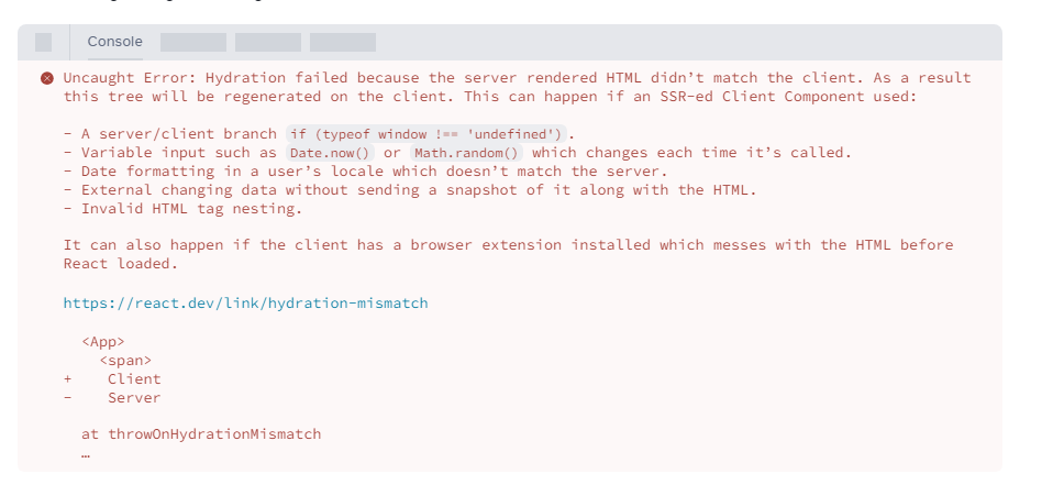 hydrating 시 클라이언트에서 렌더링하는 요소가 서버의 HTML에 있는 요소와 일치하지 않으면 React는 클라이언트의 재 render에 의해 콘텐츠를 수정하도록 강제합니다. 이전에는 타사 스크립트나 브라우저 확장에 의해 요소가 삽입되면 불일치 오류가 발생하고 클라이언트가 렌더링합니다.